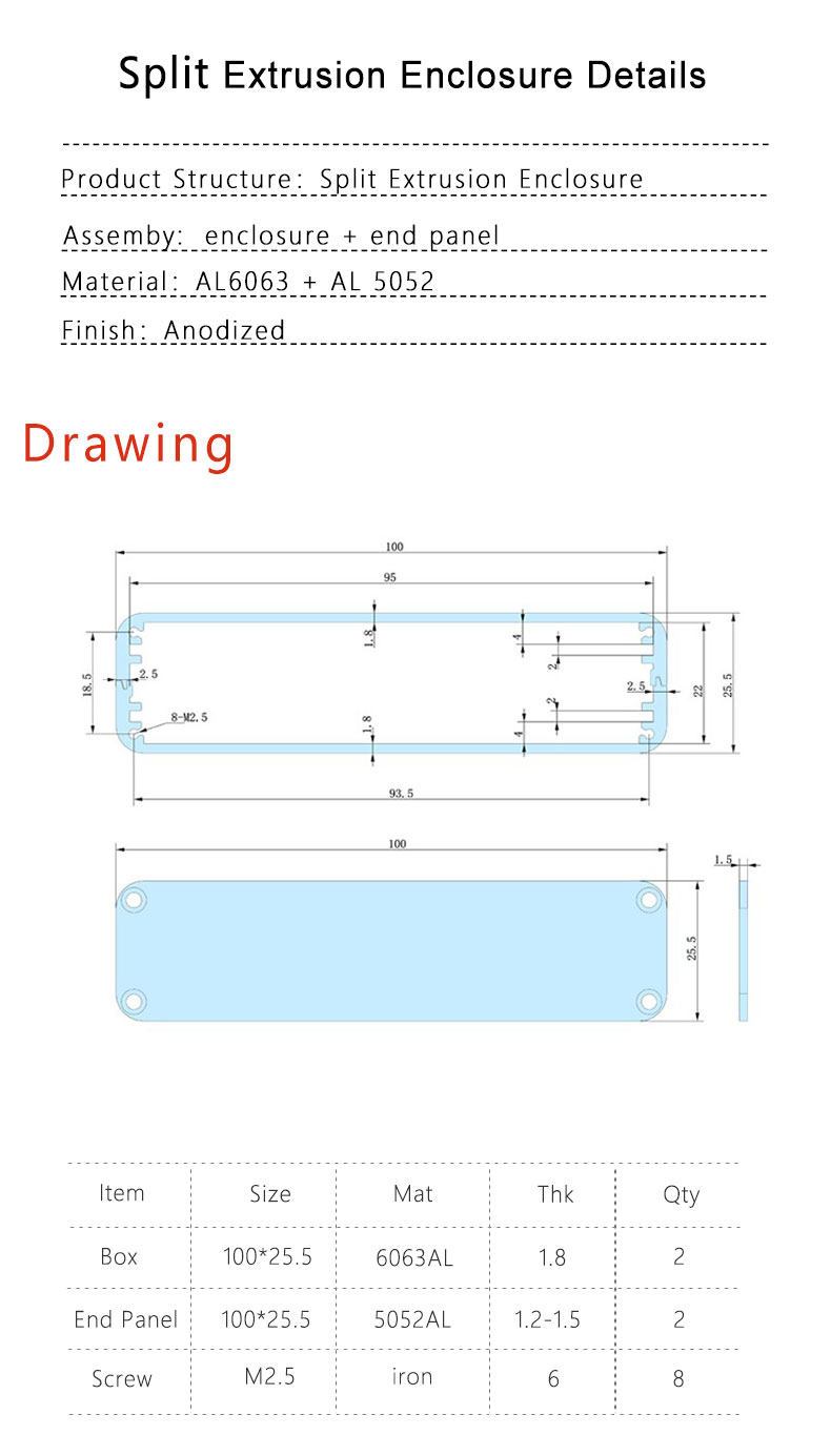 Brand:Pumay External Size: 100 x 25.5 x L mm (3.93'' x 1.0'' x L'') StructureProfessional Split-Body (Easy Assembly) Material: High-Grade Aluminum Alloy 6063-T5 Standard Color: Industrial Matte Black (Anodized) Stock Length 100 mm (Custom lengths available on request) Weight Approx. 0.2 KG (Lightweight yet Durable) Price Range $1.00 - $5.00 (Tiered pricing for bulk orders)